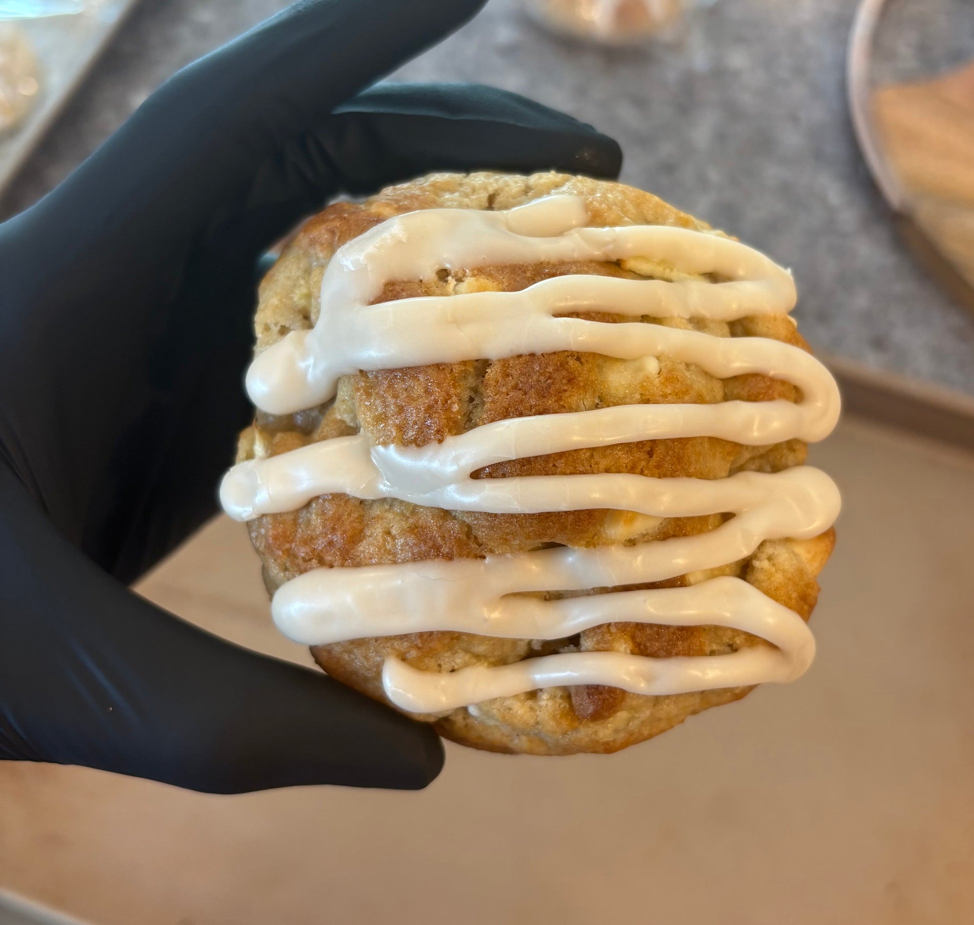 Apple cider dough packed with chopped apples and white chips and topped with an apple cider glaze