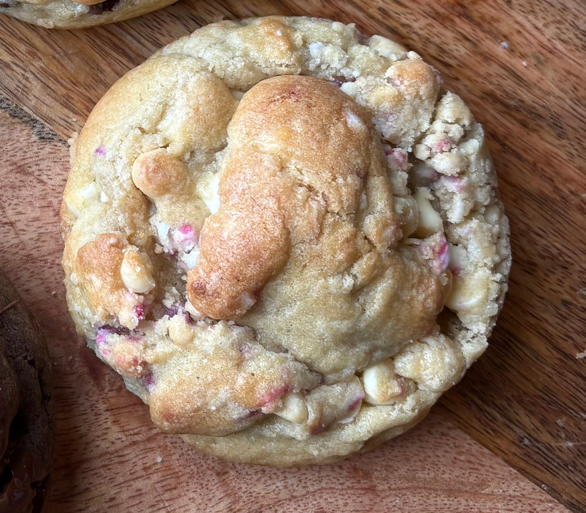 cake batter cookie with a hint of peppermint, packed with white chips and crushed candy cane